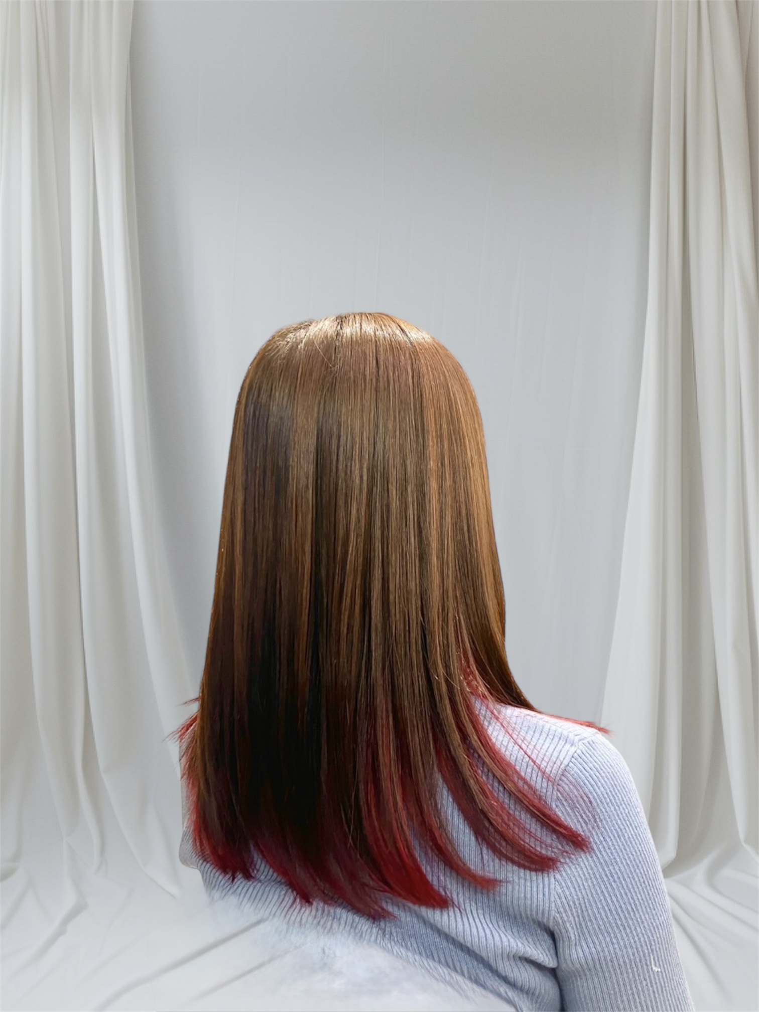 「艶ストレートの質感が、ピンクレッドインナーカラーによって、より引き立ちますね☆」