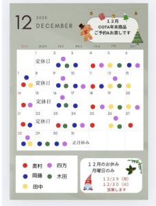 2025/11/01 12月のスタイリスト個々のお休みになります 12月は月曜日のみのお休みになりめす 29日月曜日、30日火曜日は営業 31日水曜日からお正月休みとなります 年末は混み合う事が予想されます お早めのご予約お待ちしております。